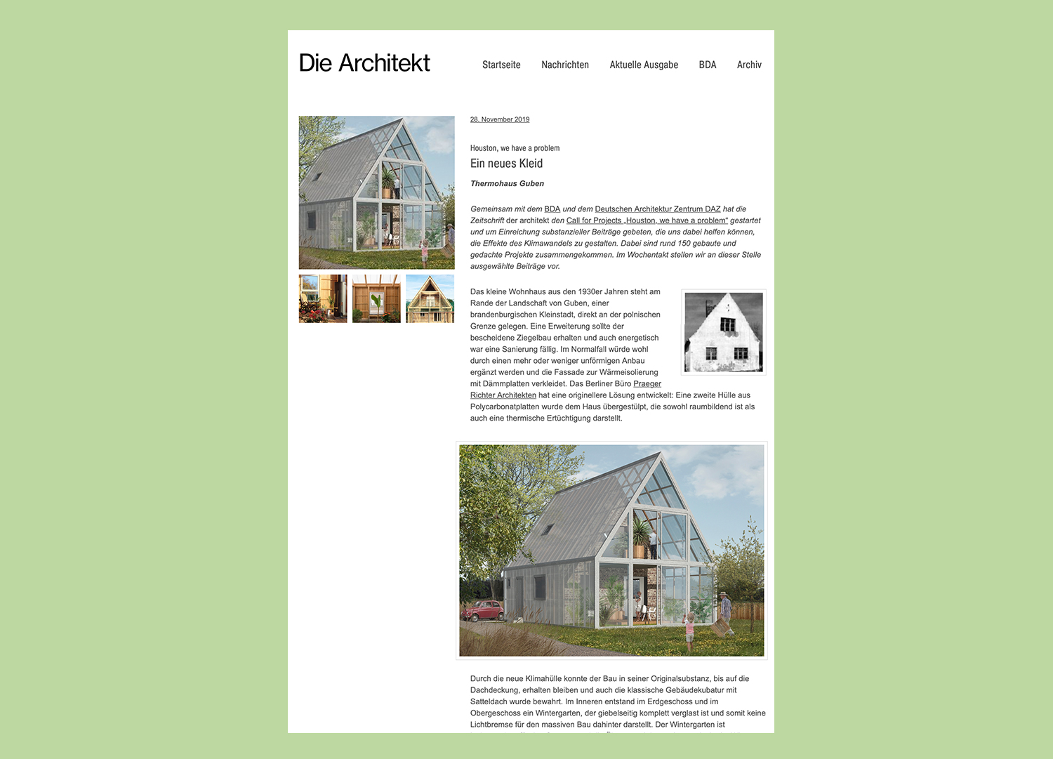 Das in den 1930er Jahren in Ziegelbauweise errichtete kleine Wohnhaus sollte kostengünstig saniert werden. Die konzeptuelle Lösung bestand darin, eine neue Klimahülle aus Polycarbonatplatten über das Bestandshaus zu stülpen. Der Bestand blieb unter Ausnahme der Dachdeckung im Originalzustand erhalten. Innerhalb der neuen Klimahülle entstand ein großzügiger Wintergarten im Erdgeschoss und im 1. Obergeschoss. Dieser erweitert die Wohnfläche vom Frühjahr bis zum Spätherbst und kann als Gewächshaus genutzt werden.